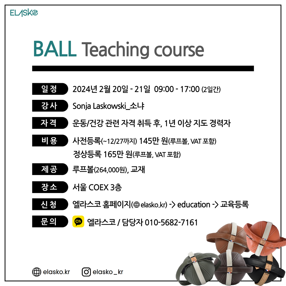Elasko Ball Teaching course / 2024.02.20~21 / 심선미 마스터 특별할인(145만->140만) / 1월 11일 까지!